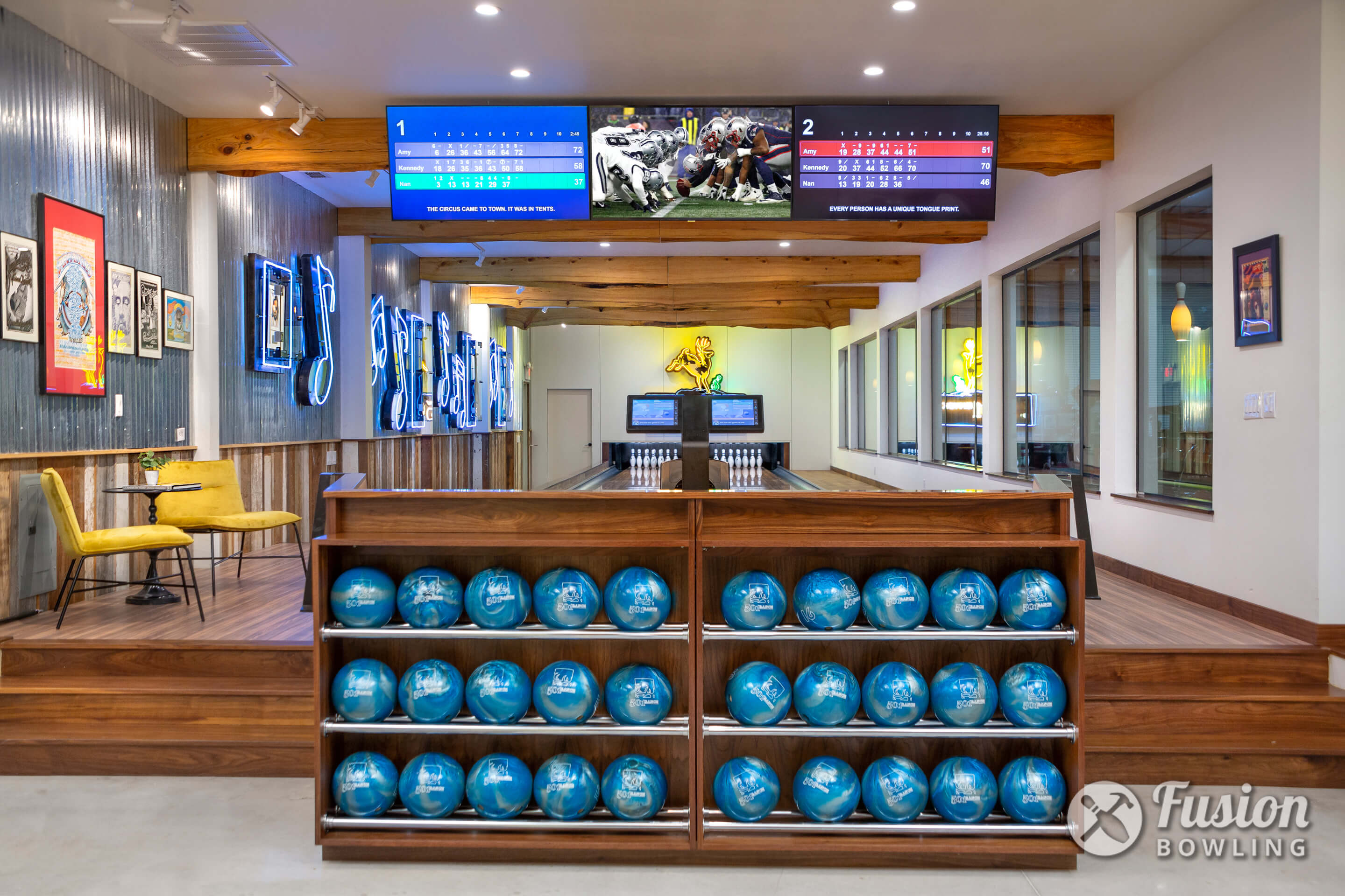 Hidden in south Texas, not far from San Antonio, is a special events venue on 12,000 acres. Guests who attend weddings, family reunions, and corporate retreats have many opportunities for recreation, including a bowling amenity inside the train depot building. The private bowling lanes were custom made to match the retro/rustic interior design style. Custom balls and pins show off the property's logo.