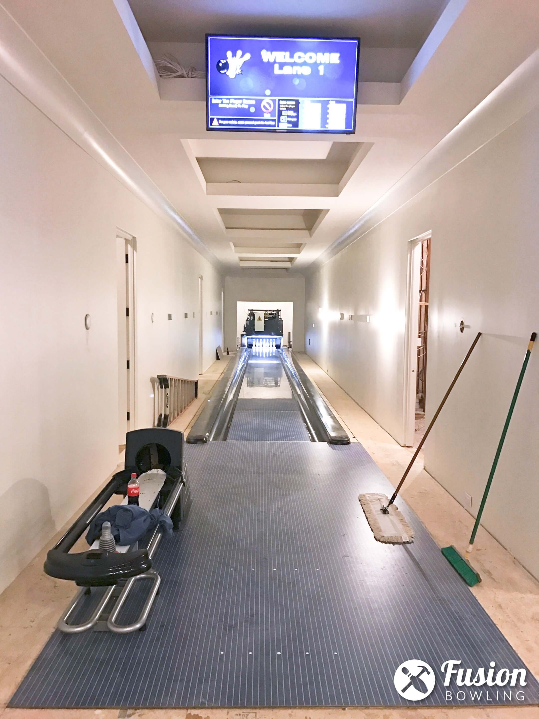 Beautiful single-lane home bowling alley has a wall-mounted scoring monitor, pins with the homeowners' monogram, back-lit translucent panels along the side walls and on the curtain wall above the pins. Ball return capping was built on both sides of the lane for a more symmetrical look.