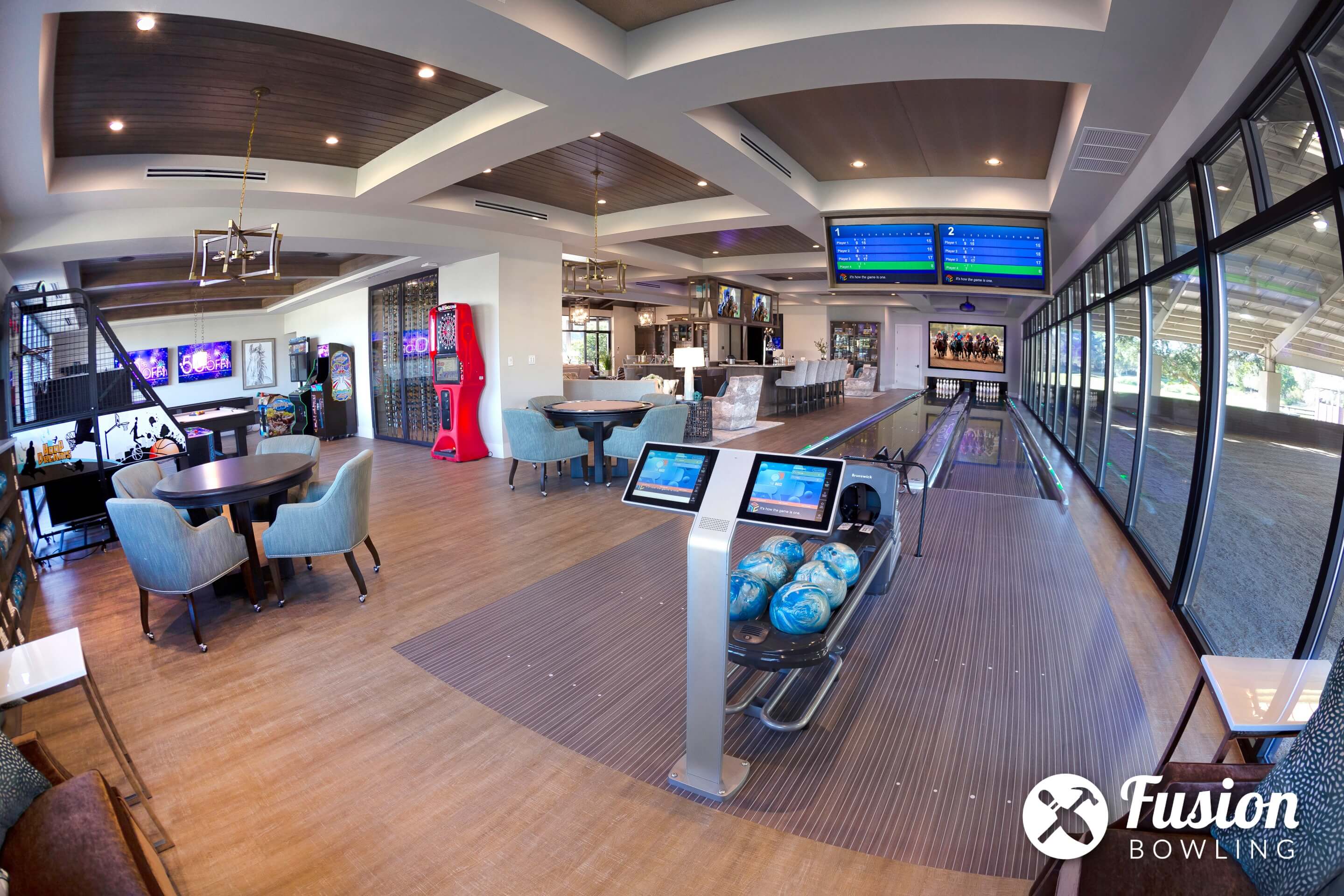 A private horse ranch in Naples, Florida has a barrel racing pavilion connected to a multi purpose recreation building that provides an entertainment space for corporate and family events. The custom two-lane bowling alley is flanked by a wall of glass for wide open views into the barrel racing area. The tray ceiling with criss-cross beams hides the UV black light fixtures that make the bowling lanes glow. A custom enclosure surrounds the ceiling-mounted bowling scoring monitors. The custom blue and silver swirl bowling balls provide a tasteful interior design accent color for the room.